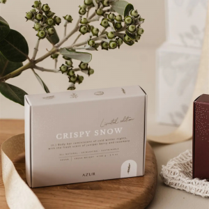 Die Körperseife Crispy Snow von Azur ist eine sanft pflegende Seife mit winterlichen Düften von Wacholderbeeren, Rosmarin und Grapefruit. Grüne Tonerde gibt dieser Seife ihre besondere grünliche Färbung und macht deine Haut wunderbar weich und geschmeidig. Versetze dich mit dieser limiterten Seife in Weihnachtsstimmung und genieße die winterliche Magie bei deiner täglichen Duschroutine! Nettogewicht: ca. 100 Gramm. Alle Seifen sind handgeschnitten, sodass das Gewicht leicht variieren kann.