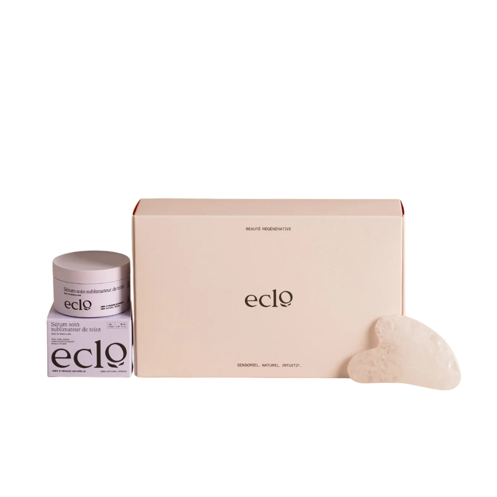 The Glow Ritual Set von Eclo ist eine exklusive Geschenkbox mit zwei perfekt aufeinander abgestimmten Produkten: dem teintverfeinernden Pflegeserum, ein Bestseller und einem Gua Sha Massagestein aus Quarz, der deine Haut zusätzlich glättet und deinem Gesicht straffere Konturen verleiht.