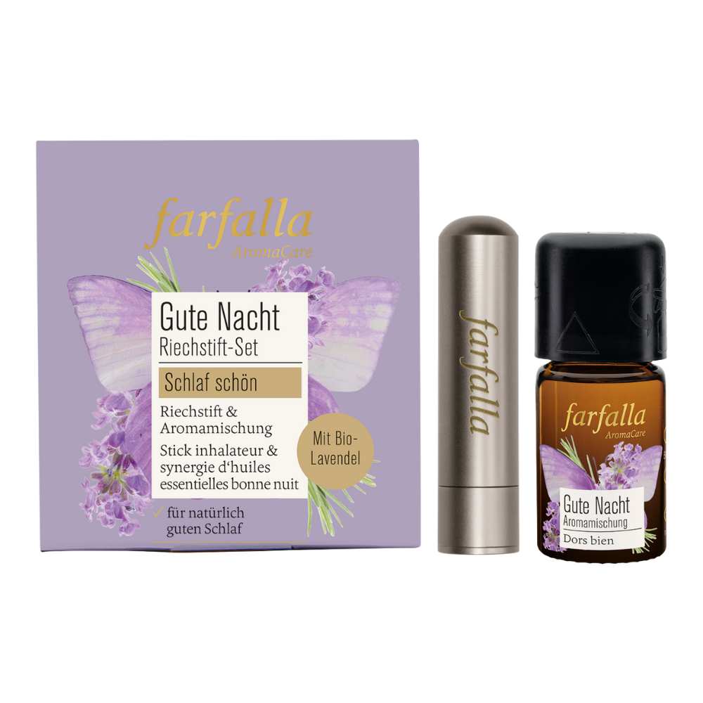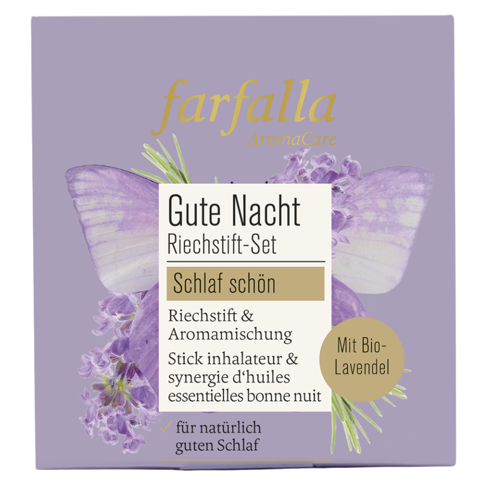 Das Gute Nacht Riechstift-Set Lavendel von Farfalla enthält einen hochwertigen Riechstift aus Edelstahl mit einem Duftvlies und einmal die Gute Nacht Aromamischung in 5ml. Auf das Duftvlies des Riechstiftes aufgetropft, entfaltet die blumig duftende Gute Nacht Aromamischung ihre entspannende Wirkung und du kannst die Gedanken des Tages loslassen. Lavendelöl und andere ausgewählte naturreine ätherische Öle wie Vanille-Extrakt, Bergamotte, Orange und Tonkabohne erleichtern dir das Einschlafen und verbessern die Schlafqualität.