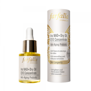 Das Iris NAD+ Dry Oil Q10 Concentrate von Farfalla ist ein Gesichtsöl mit hochkonzentriertem Q10, das die Haut sichtbar glättet und Falten reduziert. Der hochwirksame Wirkstoffkomplex mit NAD+ pflegt deine Haut und sorgt für ein revitalisiertes Hautbild. Wertvolle Pflanzenwirkstoffe unterstützen deine Haut zusätzlich bei der Zellerneuerung und minimieren die Zeichen lichtbedingter Hautalterung. Granatapfel- und Jojobaöl geben deiner Haut Spannkraft und Elastizität. Für die trockene und reife Haut geeignet.