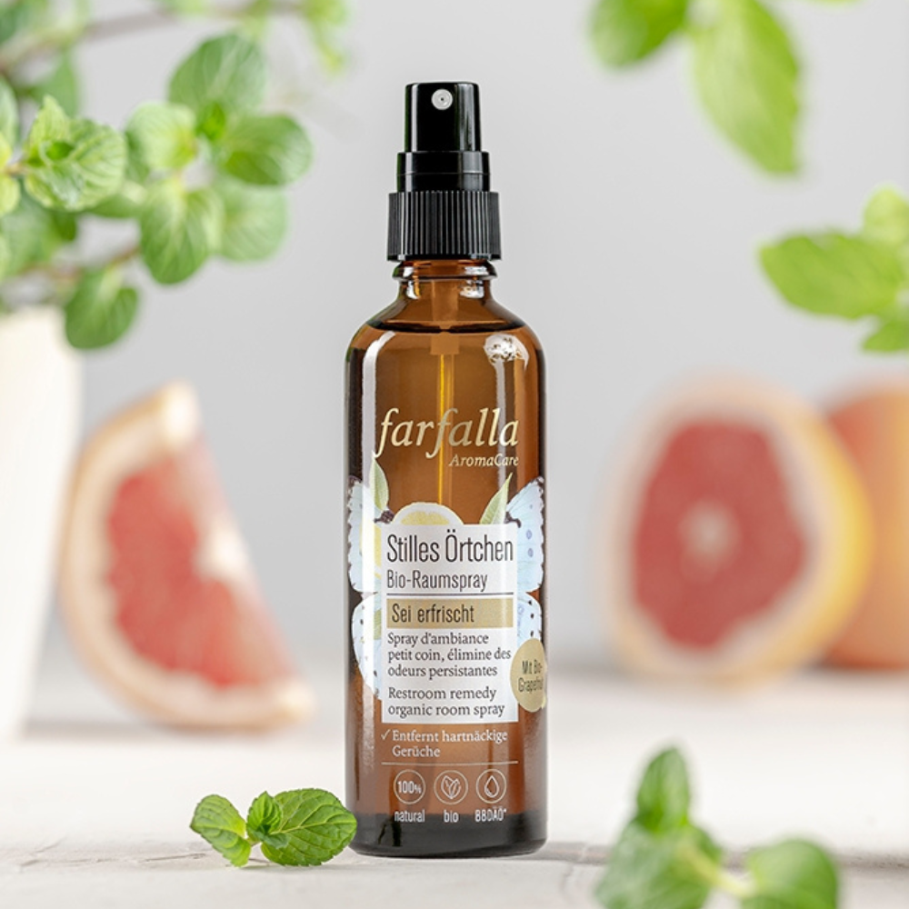 Das Sei erfrischt Bio-Raumspray Stilles Örtchen von Farfalla ist das perfekte Spray, um die Luft in deinem Stillen Örtchen zu reinigen und zu erfrischen. 100% naturreine ätherische Öle wie Grapefruit, Zedrat, Zitronengras, Minze und Myrte wirken belebend und helfen dabei, dein Stilles Örtchen als Wohlfühlort zu erhalten.