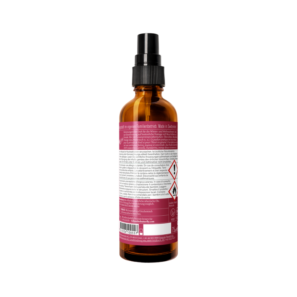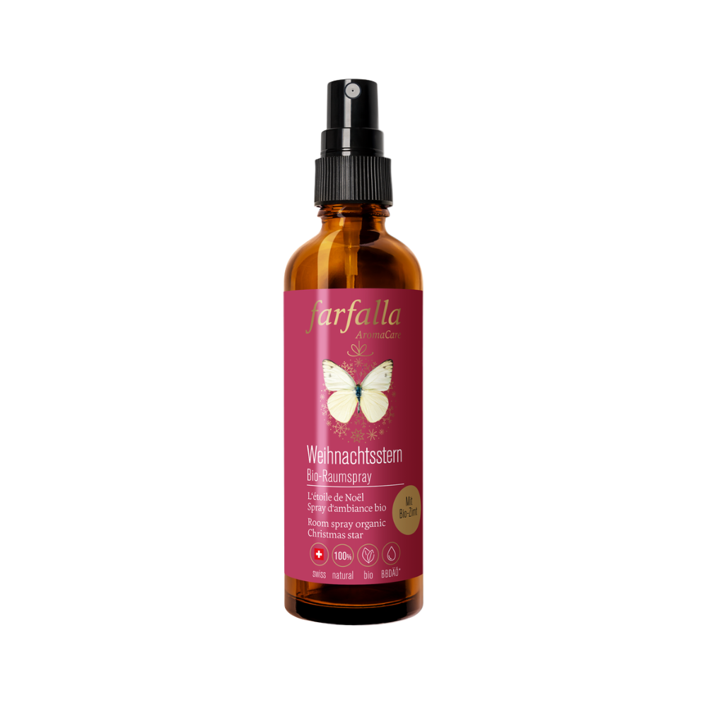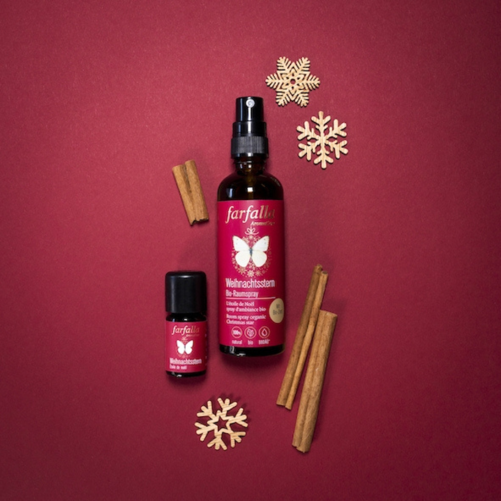 Das Weihnachtsstern Bio-Raumspray von Farfalla verströmt mit naturreinen ätherischen Ölen wie Zimt, Orange und Weihrauch einen warmen Duft in deinem Zuhause und stimmt ein auf besinnliche Festtage voll Herzlichkeit und Freude. Genieße die Winter- und Vorweihnachtszeit mit diesem herrlich weihnachtlichem Duft!