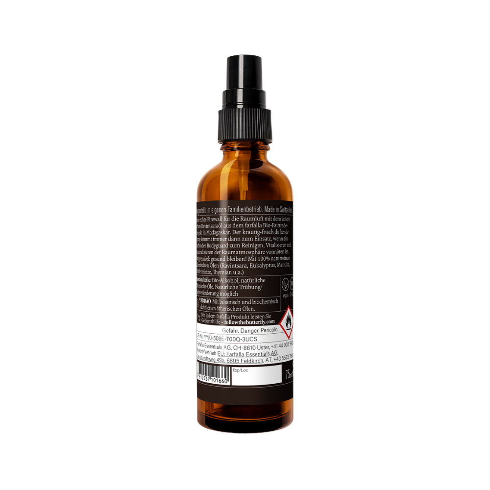 Das Winterschutz Bio-Raumspray aus der Bleib Gesund Serie von Farfalla verströmt mit naturreinen ätherischen Ölen wie Ravintsara, Eukalyptus und Manuka einen frischen krautigen Duft in deinem Zuhause. Die Raumluft wird neutralisiert und gereinigt. Dabei wirkt das Spray auch antibakteriell und ist vor allem in der kalten Winterzeit der perfekte Begleiter, wenn es darum geht, gesund zu bleiben.