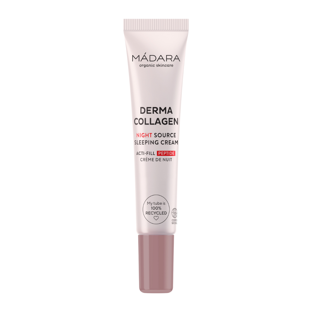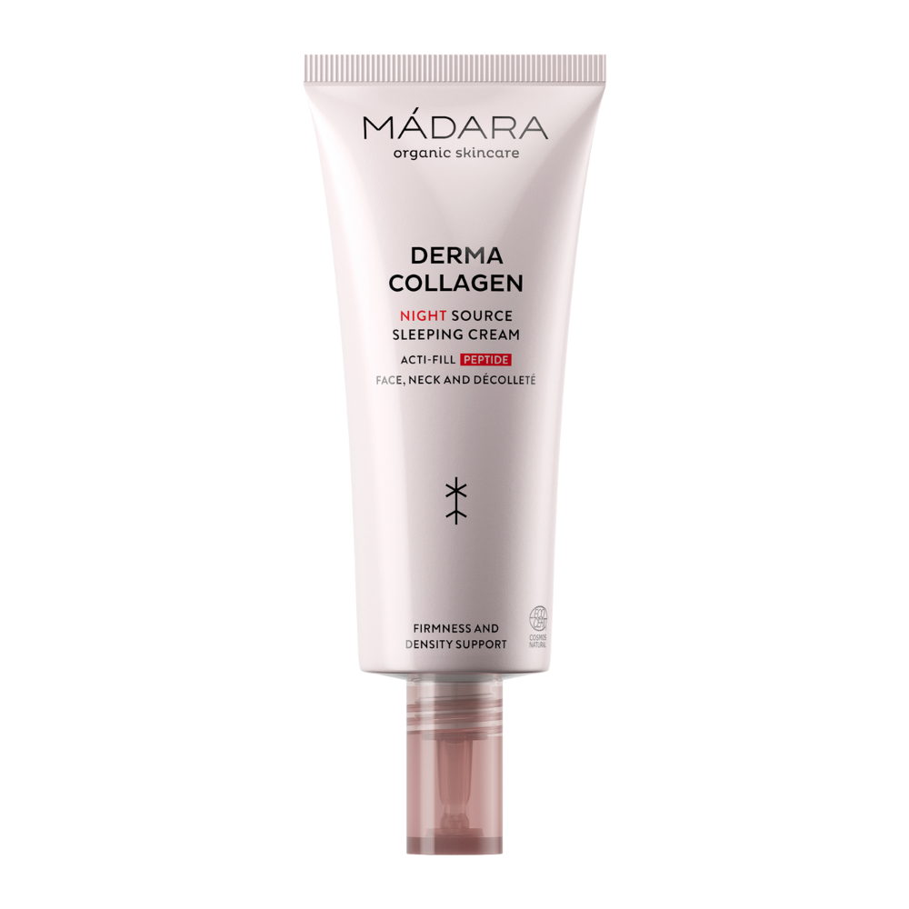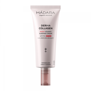 Die Madara Derma Collagen Nachtcreme aus der Derma Collagen Hautpflege Serie basiert auf einer Formel aus natürlichen Peptiden, Phytosterolen, Algenextrakt und Hyaluronsäure. Diese Inhaltsstoffe stimulieren die Kollagensynthese und unterstützen die Hauterneuerung über Nacht. Durch den verbesserten Kollagenhaushalt verbessert sich die Struktur und Spannkraft Ihrer Haut. Die reichhaltige Textur versorgt die Haut intensiv mit Feuchtigkeit. Lädt die Haut mit essentiellen Proteinen, Aminosäuren und Lipiden auf und stärkt die Epidermis. Vermindert das Auftreten von Linien und Fältchen. Hält die Haut glatt, jugendlich straff und geschmeidig.
