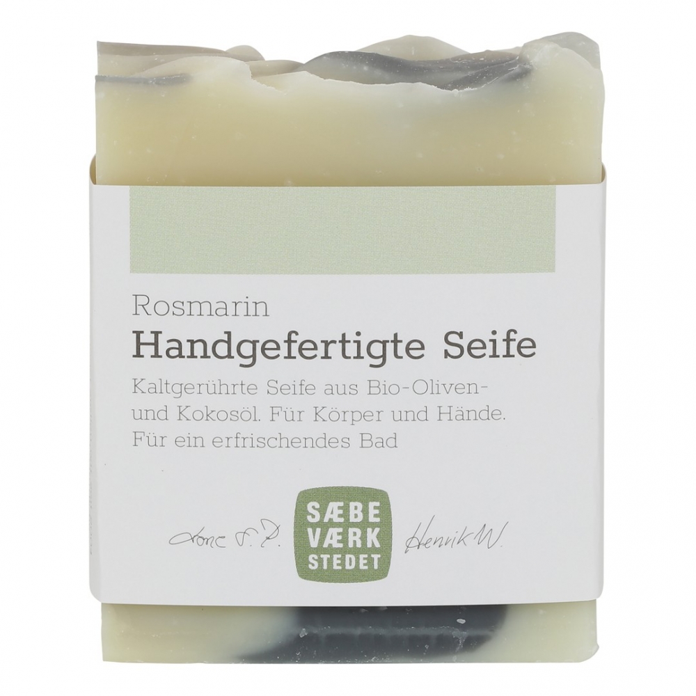 Der Duft von Rosmarin hinterlässt ein frisches und reines Gefühl. Die Seife wird mit schwarzem, organischem Ton aus Australien gesprenkelt, wodurch eine spannende grafischen Wirkung entsteht, die jede Seife ein wenig einzigartig macht.