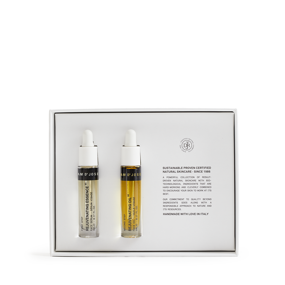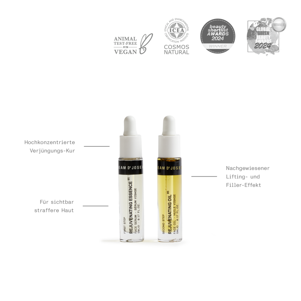 Die Rejuvenating Essence (Step 1) ist ein hochkonzentrierter Skin Booster mit „grünem Kaviar“ (Caulerpa lentillifera), nieder- und hochmolekularer Hyaluronsäure, Seetang Extrakt, Stammzellenextrakten von Cistus, Kaktusfeige, Jiaogulan (Gynostemma pentaphyllum) sowie biotechnologisch-fermentierten Wirkstoffen wie Bacillus-Ferment, Pseudoalteromonas Ferment Extract und Saccharomyces Ferment Lysate Filtrate, welche die Festigkeit der Haut erhöhen, Falten sichtbar reduzieren, Konturen straffen und ein ebenmäßiges Hautbild verleihen. Die Haut wird mit wertvollen Mineralien, Aminosäuren, Peptiden und Vitaminen versorgt und optimal durchfeuchtet.