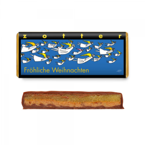 Diese handgeschöpfte Schokolade von Zotter bringt den Duft und den Geschmack der Weihnachtszeit perfekt auf den Punkt. Eine leckere dunkle Milchschokolade 50%, gefüllt mit einer Schicht Gewürzmarzipan, aufgestrichen auf hausgemachtem Haselnussnougat, wunderbar würzig nach Zimt duftend. Mit dem weihnachtlichen Motiv mit Goldeffekt auf der Verpackung, eignet es sich bestens als kleine Freude für ihre Liebsten in der Weihnachtszeit.